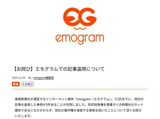 12/2(火) 23:00産経新聞社は2日、同社が運営するネットメディア「emogram(エモグラム)」が11月中に配信した記事5本で他のメディアの記事を盗用していたと発表した。いずれも同じ派遣スタッフが執筆し、業務委託先の編集者がチェックした記事だったという。産経新聞は「深くお詫(わ)び申し上げます」などとコメントしている。