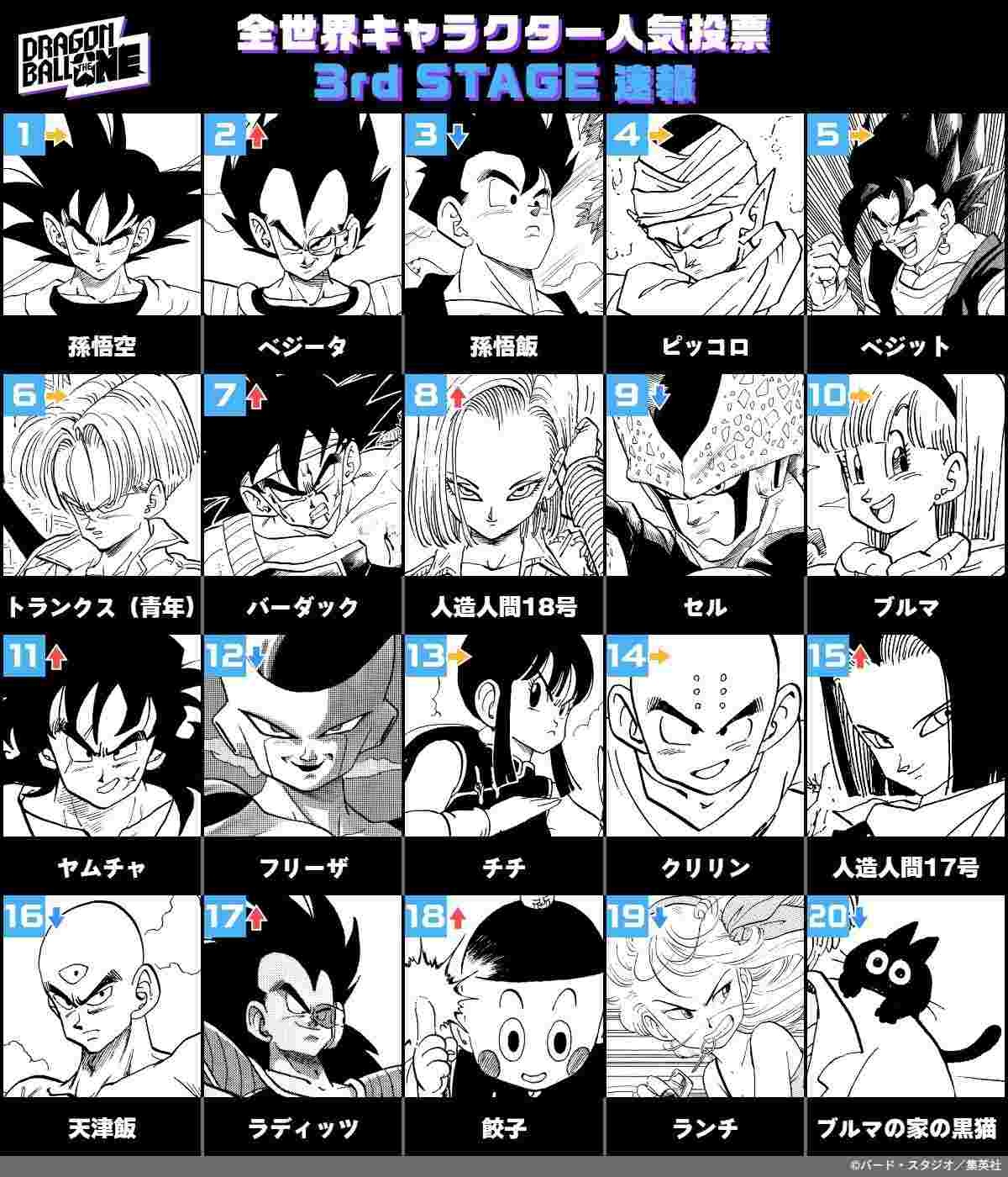 20位まで発表されており、この結果にネット上では「悟空は安泰だから2位はやっぱベジータが似合う。しかしセルがフリーザより上なのは意外だね」「ゴテンクス厳しいか?」「黒猫とラディッツ根強いな」などと反応している。