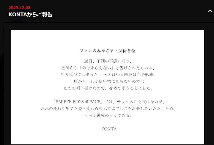 BARBEE BOYS(バービーボーイズ)のKONTA(Vo.& SAX)が8日、自身の公式サイトを通じ、「四肢が完全麻痺」の状況であることを明らかにした。