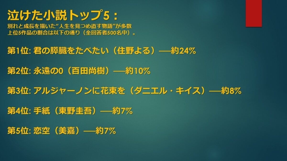 TOP5を下から見ていくと、『恋空(著:美嘉)』、『手紙(著:東野圭吾)』、『アルジャーノンに花束を(著:ダニエル・キイス)』、『永遠の0(著:百田尚樹)』、『君の膵臓をたべたい(著:住野よる)』がランクインしていました。