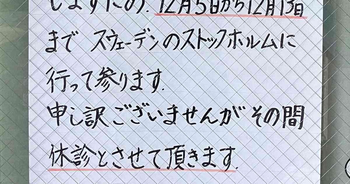 張り紙には「12月5日から12月13日まで、スウェーデンのストックホルムに行って参ります」と書かれており、張り紙の写真がSNSで話題に。中にはX(ツイッター)で2830万回表示されたものもあり、「世界規模の理由だったw」「名誉な休診理由」「これには誰も文句言えません」などと驚きのコメントで埋められた。