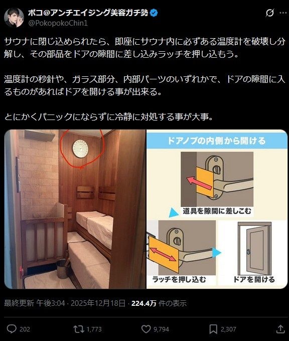 これトイレから脱出する方法で2年前にYouTubeで上がってたが、サウナの件で昨日見たわ