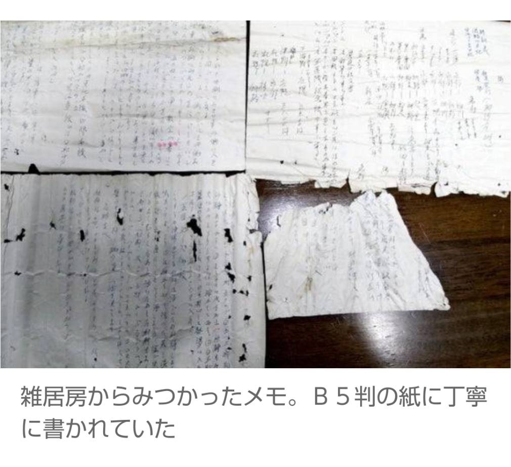 雑居房からみつかったメモ。B5判の紙に丁寧に書かれていた。メモは、今年6月から耐震工事が始まった「五翼放射状舎房」の雑居房で、床板の隙間に小さく丸められた状態で見つかった。