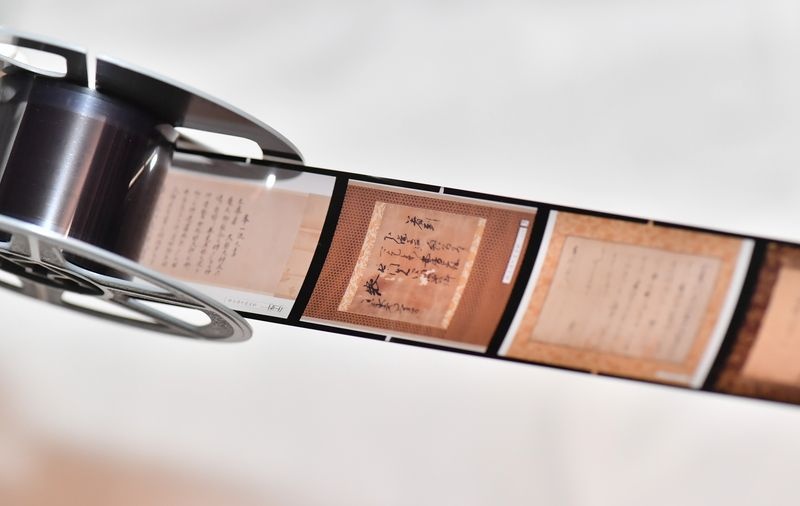 今月上旬、同館文献史料課の村石正行課長(54)が書庫内でマイクロフィルムの保存状態を確認していた。箱から取り出した20年以上前のフィルムを室内灯に透かすと、撮影された古文書が精細に浮かび上がった。