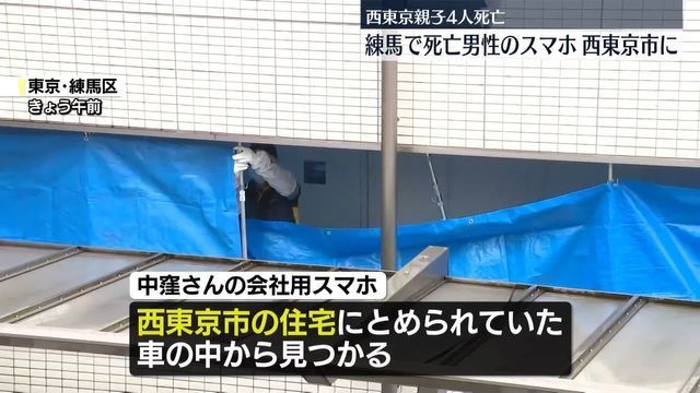 東京・西東京市の住宅で親子4人が死亡し、その後、母親が借りているマンションで男性の遺体が見つかった事件で、男性のスマホが西東京市の住宅にとめてあった車の中から見つかったことがわかりました。 今月1