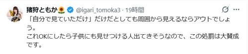 猪狩はXで「『自分で見ていただけ』だけだとしても周囲から見えるならアウトでしょう」と主張。「これOKにしたら子供にも見せつける人出てきそうなので、この処罰は大賛成です」とつづっている。