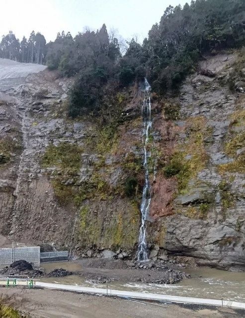 2024年元日の地震と同年9月の豪雨で、この左岸は大きく崩れ落ちた。大量の土砂や倒木の撤去作業を続けたところ、滝が現れた。