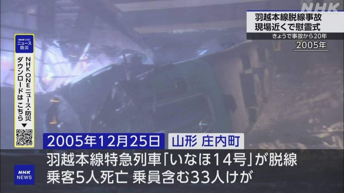 2005年の12月25日、山形県庄内町を走行していた羽越本線の特急列車「いなほ14号」が脱線し、乗客5人が死亡、乗員を含む33人がけがをしました。