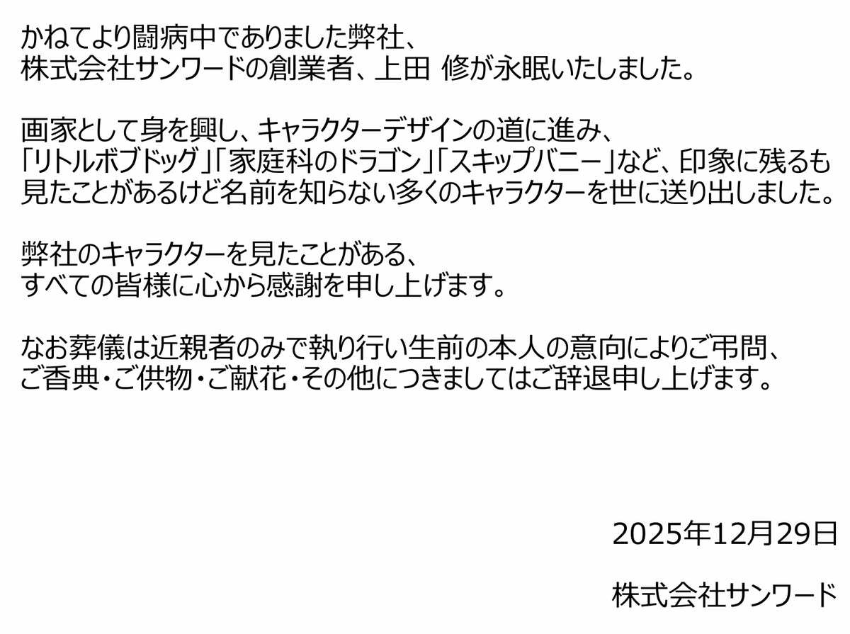 サンワードはXで、「かねてより闘病中でありました弊社、株式会社サンワードの創業者、上田修が永眠いたしました」と報告。「画家として身を興し、キャラクターデザインの道に進み、『リトルボブドッグ』『家庭科のドラゴン』『スキップバニー』など、印象に残るも 見たことがあるけど名前を知らない多くのキャラクターを世に送り出しました」と故人を偲び、「弊社のキャラクターを見たことがある、すべての皆様に心から感謝を申し上げます」と感謝を伝えた。
