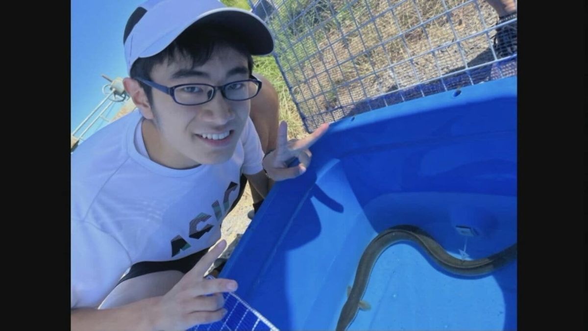 ウナギ愛あふれるこの男性こそ、バナナウナギを引き取ることになった十万翔太(じゅうまん・しょうた)さん(20)、九州大学農学部の2年生です。黄色と黒のぶち模様。