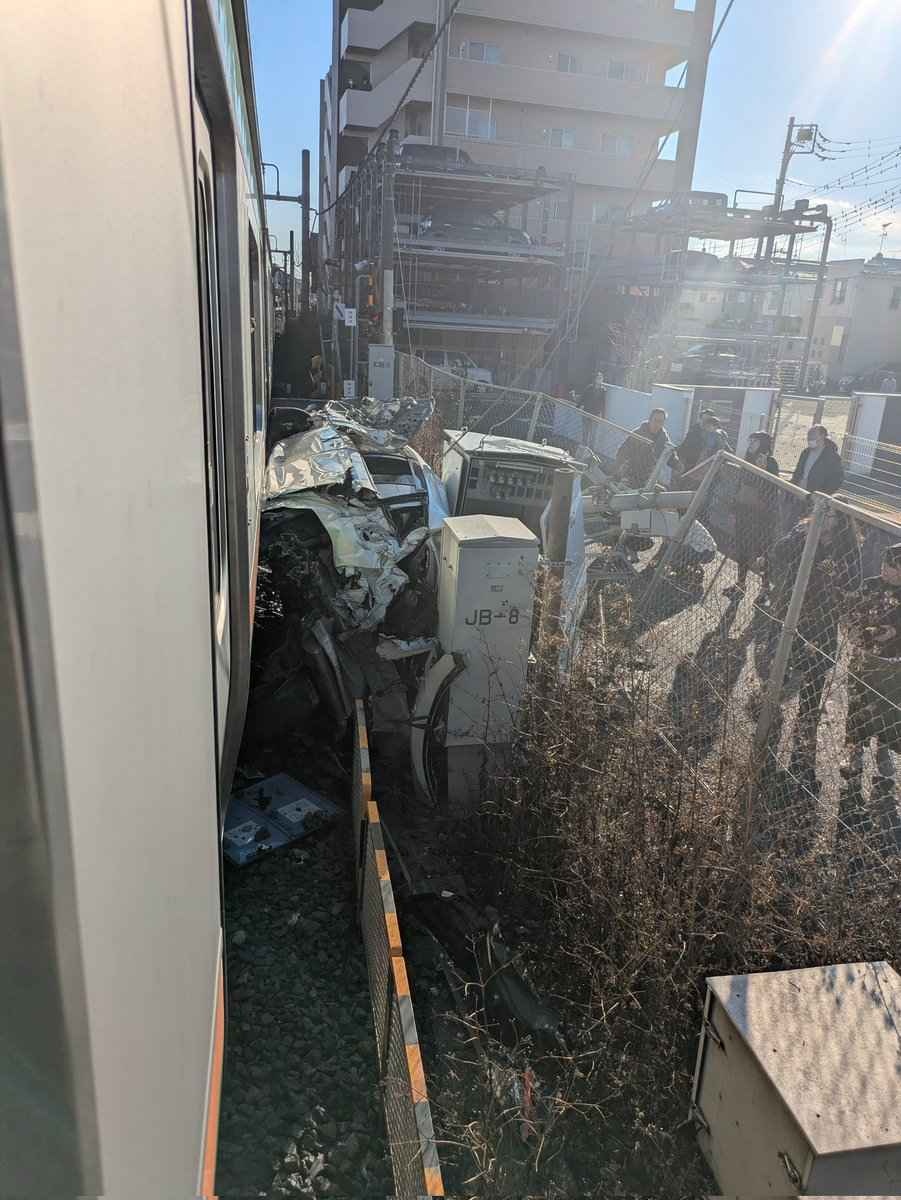 - 新白岡の駅を出てすぐの踏切だしそこまでスピード出てそうな印象もないけど、だいぶ派手に散ったね車