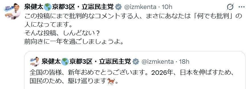 立憲議員が苦言「この投稿にまで批判的なコメントする人、あなたは『何でも批判』の人に…」(日刊スポーツ) - Yahoo!ニュース立憲民主党の泉健太前代表が1日夜、自身のX(旧ツイッター)を更新。一部のコメントに対し苦言を呈した。 泉氏は1日昼すぎ、新年のあいさつ動画を添付。そこでは「2026年、新年おめでとうございますnews.yahoo.co.jp立憲民主党の泉健太前代表が1日夜、自身のX(旧ツイッター)を更新。一部のコメントに対し苦言を呈した。
