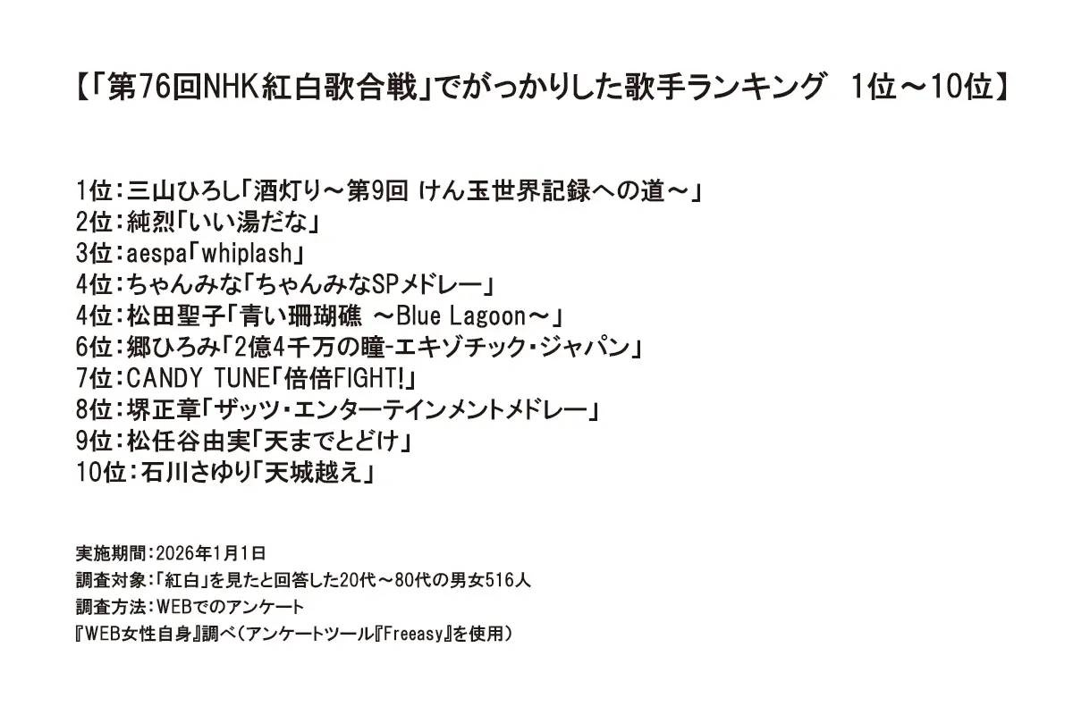 第76回NHK紅白歌合戦』で がっかりした歌手ランキング…3位aespa、2位 純烈 を抑えた1位は?
