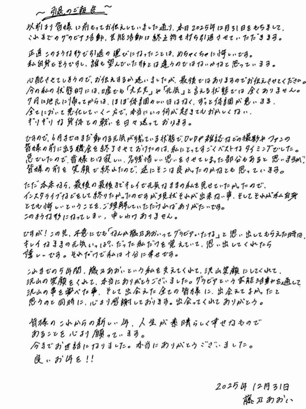 藤乃さんは2020年7月にデビュー。24歳だった23年4月に希少がん「副咽頭間隙腫瘍」と公表し、治療に専念。その後、24年8月に芸能活動を再開した。昨年3月末で所属していた事務所を退所し、フリーで活動していたが、同年7月に年内での芸能活動引退を表明していた。