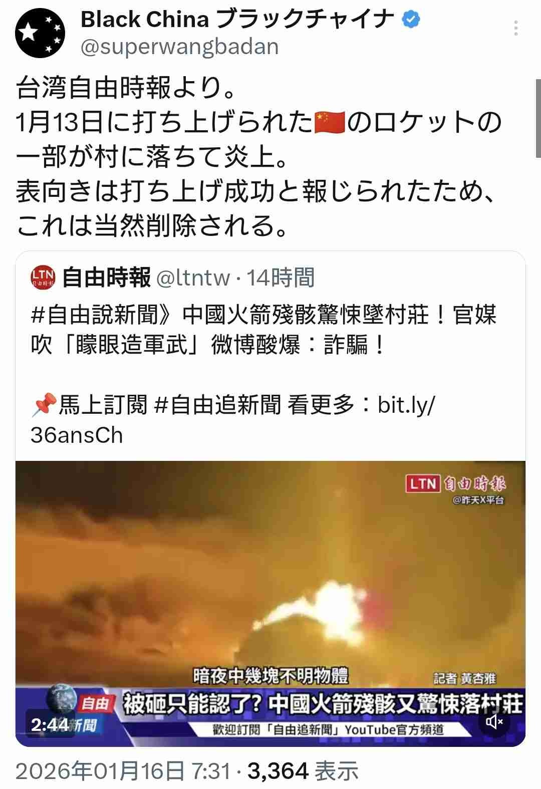 1月13日に打ち上げられた中国のロケットの一部が村に落ちて炎上。もちろん打ち上げ成功と報じられる