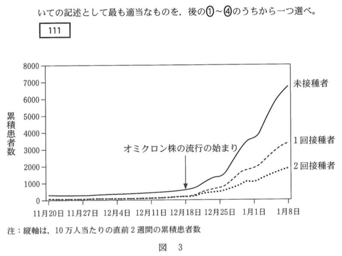 問題では、米ロサンゼルスでオミクロン株が流行した時期(2021年11月~22年1月)における、ワクチン接種回数ごとに示された「10万人当たり・直前2週間の累積患者数のグラフ」が提示された。ワクチン未接種・1回接種・2回接種の3つのグループで、感染者数の増え方の違いを比較するよう求められた。