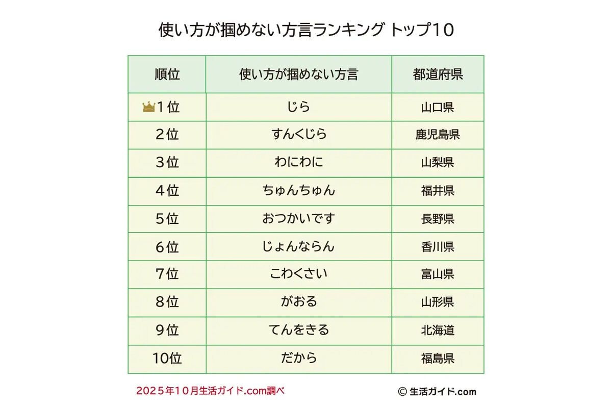 3位は山梨県の方言「わにわに」。甲州弁では「ふざけないで・調子に乗らないで」という意味を持つ。アンケート回答者からは「こんなのわかるわけない…」という声も寄せられている。
