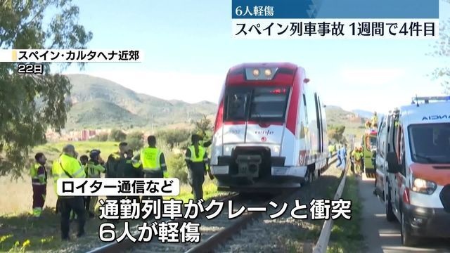 スペインの南東部で22日、通勤列車とクレーンが衝突し、複数人がケガをしました。スペインで列車に関連する事故は1週間で4件目です。