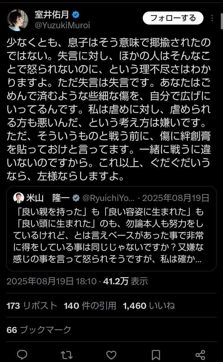 米ちょも山らんま「室井佑月は最悪の嫁」「役不足」「ワガママで迷惑かけるな」と誹謗中傷してしまう