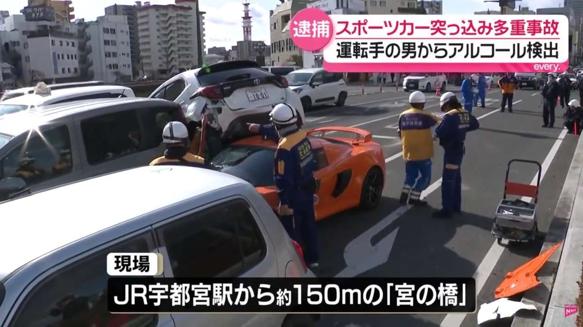 30日正午過ぎ、栃木県のJR宇都宮駅前でスポーツカーが車に突っ込み、あわせて5台が絡む事故がありました。警察は、スポーツカーを運転していた男から基準値以上のアルコールが検出されたとして逮捕されました。