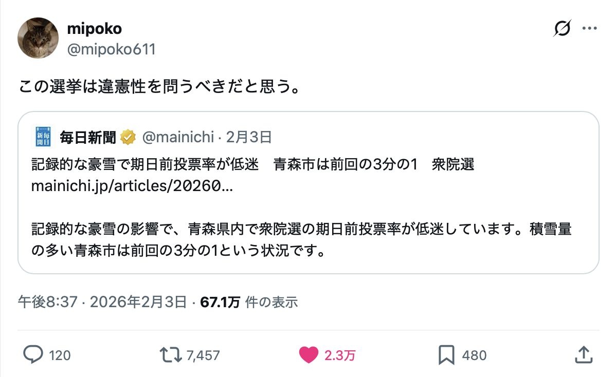 今回は天候にも関わらず意外と投票率高いと思うわ - 21 : 2026/02/05(木) 23:46:57.25 ID:xAjLrrY30