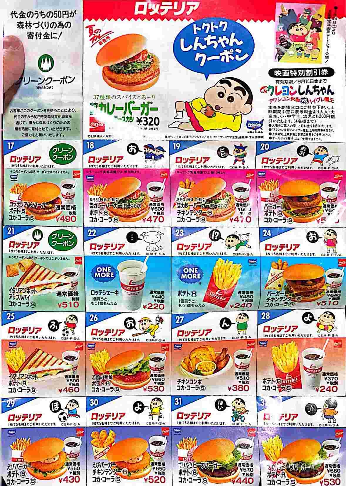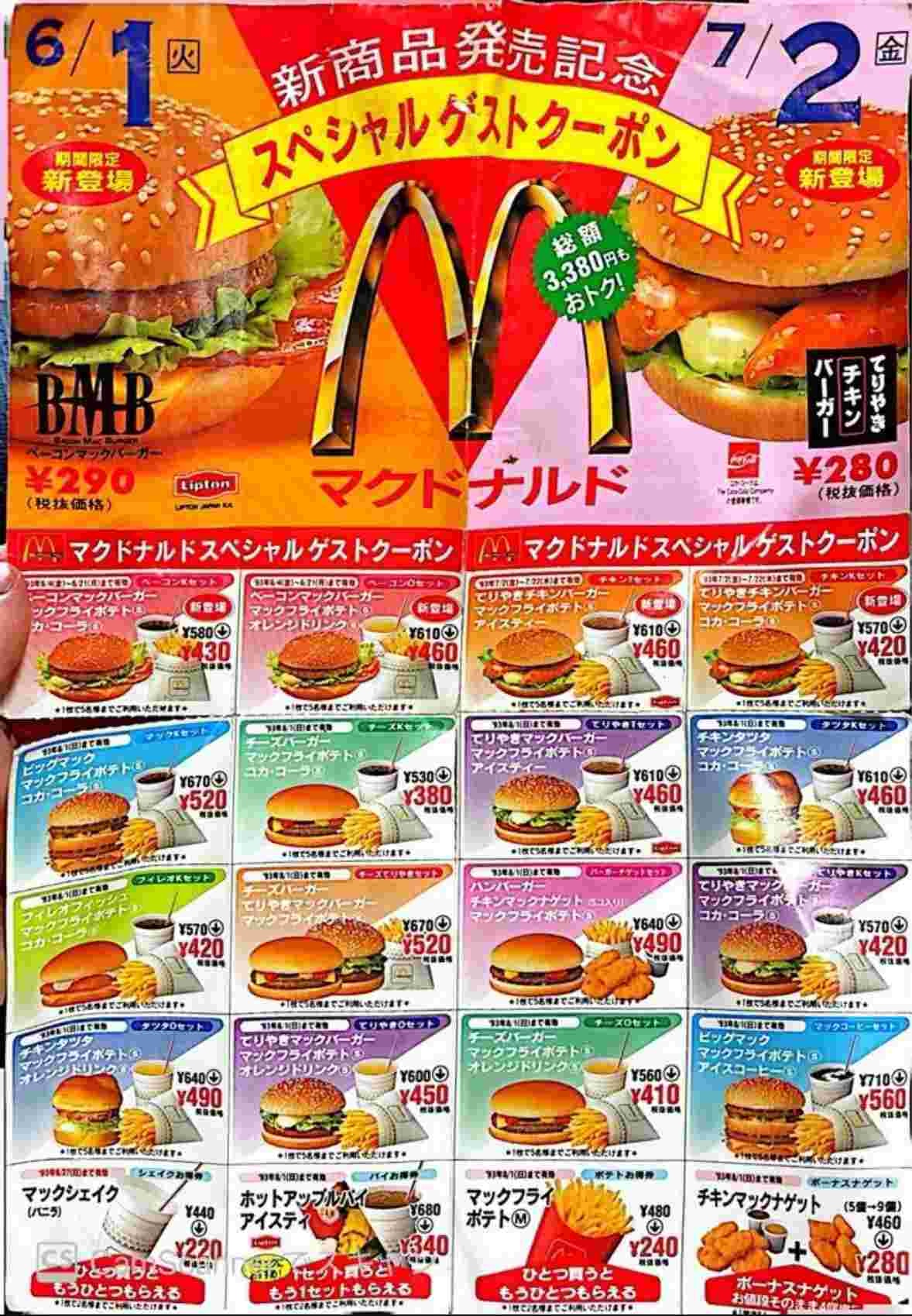 マクドナルドのほうは、当時の新商品「ベーコンマックバーガー」と「てりやきチキンバーガー」の発売を記念したもの。定価はそれぞれ290円・280円で、季節限定バーガーが500円前後の現在からすると、かなり安い印象を受けます。もっとも、東京都の最低時給が620円だった年の話ではありますが(参考:労働基準監督署の資料)。