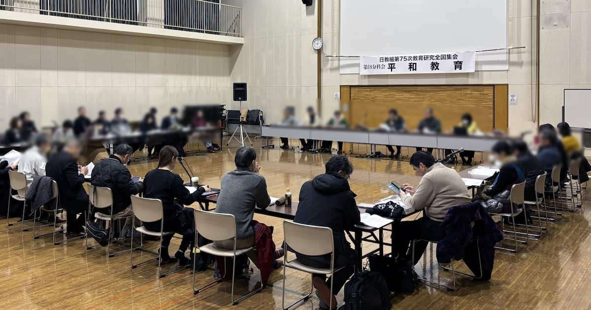 「平和教育」に関する授業実践例が報告された教育研究全国集会(教研集会)の分科会=2026年1月24日午前、三重県(画像を一部処理しています)