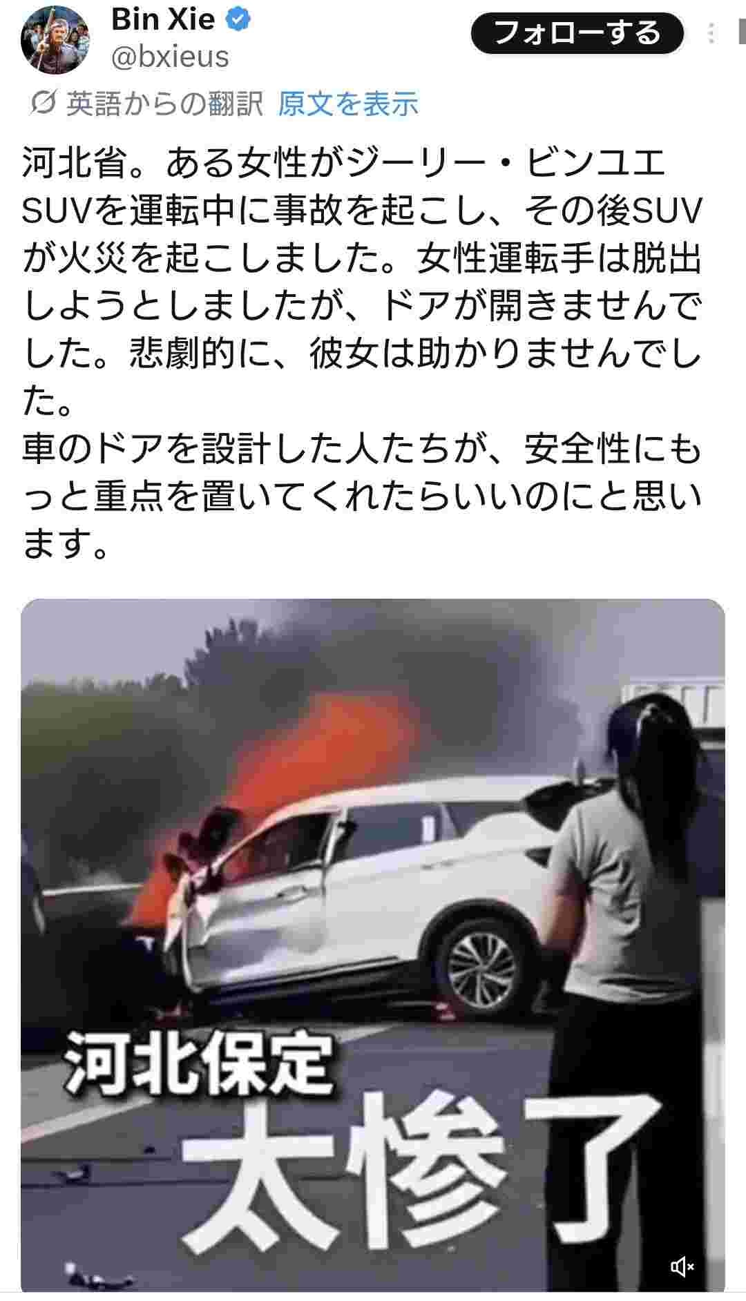 中華EV、事故で炎上。ドアが開かず女性ドライバーが焼かれて死亡😨
