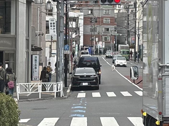 写真には、車が行き交う原宿の車道の真ん中を、真っ白で大きな毛並みが特徴のサモエドと思われる犬が、一匹で勢いよく走っている様子が収められている。周囲には乗用車やトラックが走行しており、一歩間違えれば事故につながりかねない状況だ。
