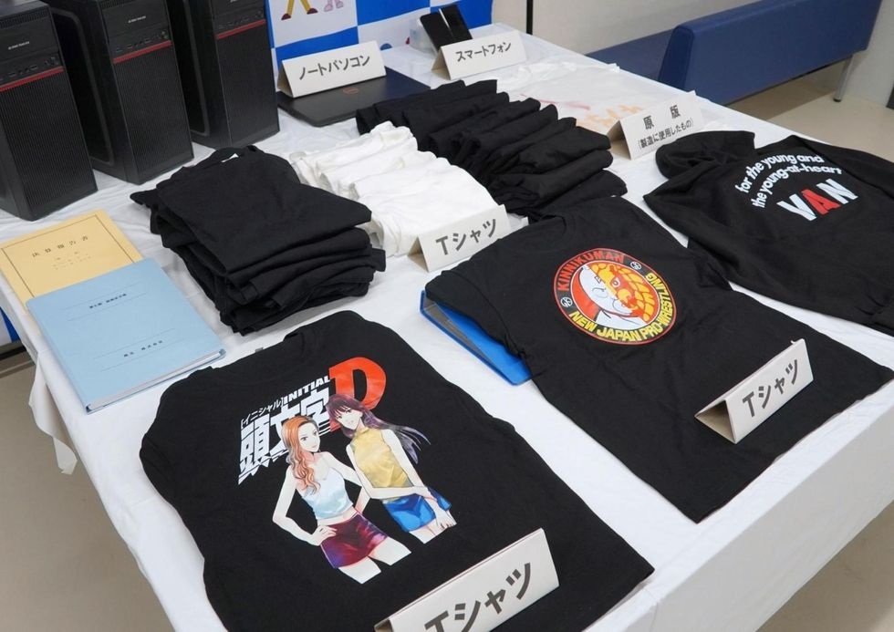 昨年10月、工場の火災報知機が作動し、現場の確認に訪れた同署員が不審なTシャツを発見。今年1月23日に家宅捜索を実施したところ、頭文字Dのほか、新日本プロレスと人気漫画「キン肉マン」のコラボレーションTシャツ、ブランド「VAN」のパーカなどの模倣品44点を押収した。