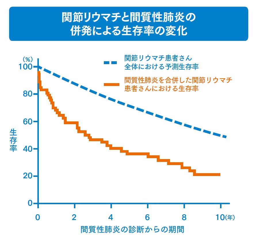 関節リウマチの間質性肺炎は生命予後を左右し、起こすと50%が5年以内に死亡するんですよ