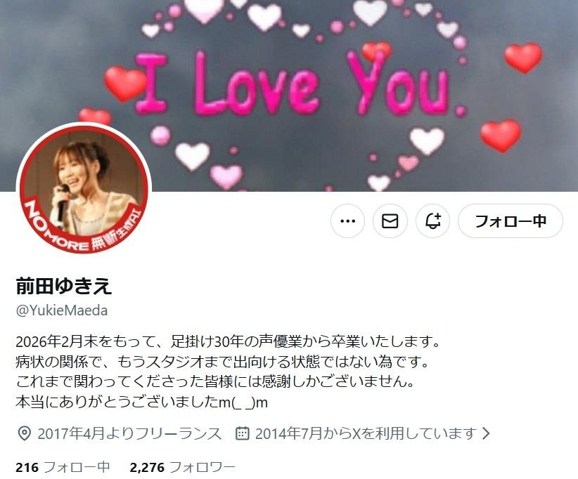 2月26日の投稿では「2026年2月末をもって、足掛け30年の声優業から卒業いたします」と報告。「病状の関係で、もうスタジオまで出向ける状態ではない為です」と説明し、「これまで関わってくださった皆様には感謝しかございません。本当にありがとうございました」と感謝をつづった。
