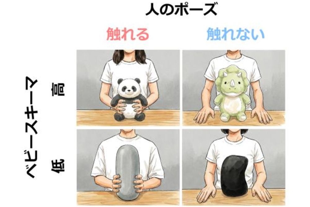 大阪大は母語が日本語の198人と、米国籍で母語が英語の199人にアンケートを実施した。多くの人がかわいいと感じる特徴を持つパンダなどのぬいぐるみと、そうした特徴を持たないクッションを使って実験した。被験者にはぬいぐるみとクッションに顔が見えない男女が両手で触れている様子と、触れていない場面の計4種類の写真を見せた。