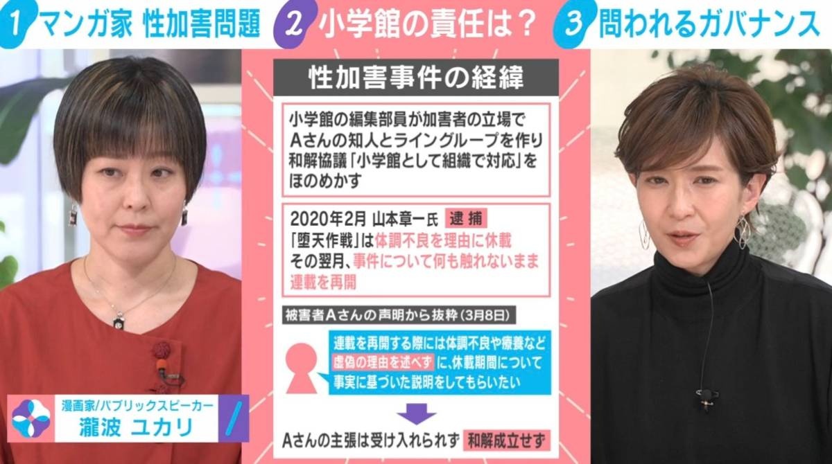 3/19(木) 11:30小学館で立て続けに起きている一連の性加害問題が波紋を呼んでいる。ニュース番組『わたしとニュース』では、この問題の経緯と出版社の対応について、多くの出版社と親交がある漫画家の瀧波ユカリ氏とともに深掘りした。