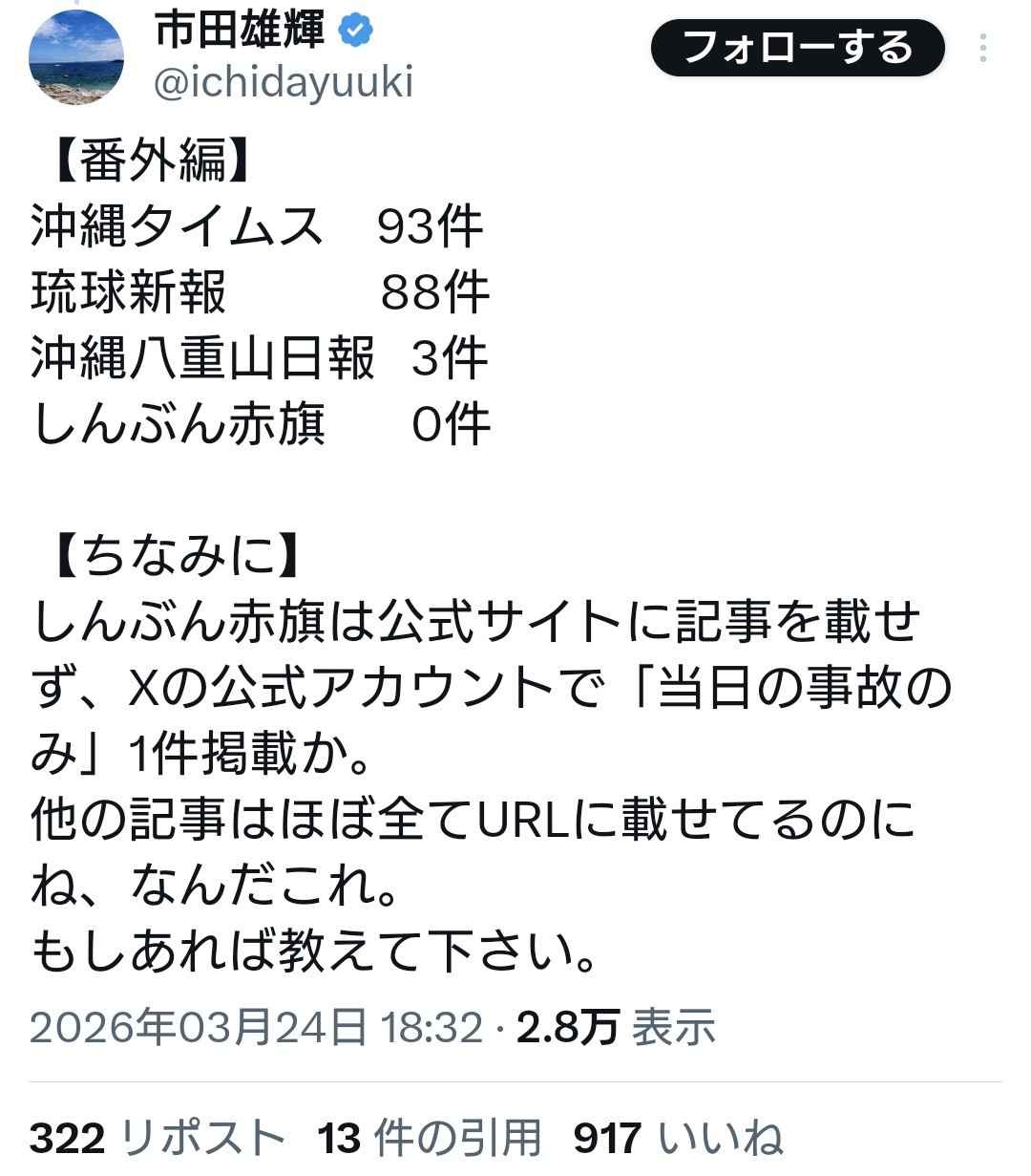 - 八重山日報が少ないのが以外だな