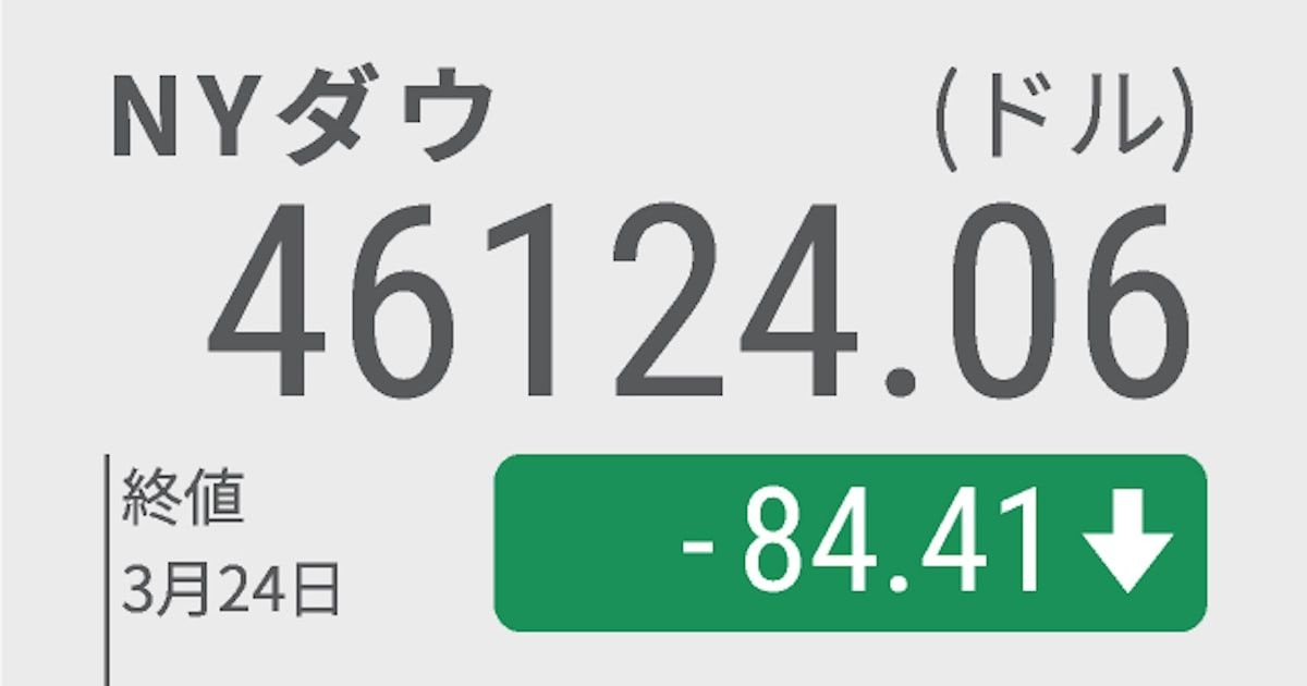 【NQNニューヨーク=横内理恵】24日の米株式市場でダウ工業株30種平均は反落し、終値は前日比84ドル41セント(0.18%)安の4万6124ドル06セントだった。米国・イスラエルとイランの軍事衝突が長期化するとの懸念が引き続き相場の重荷だった。停戦に向けた交渉が本格化する可能性も意識され、ダウ平均は上げる場面もあった。