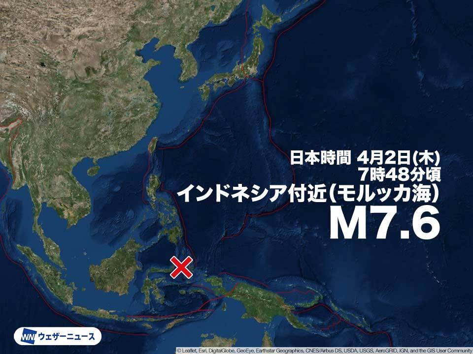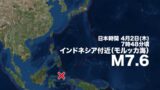 【海外地震情報】日本時間の4月2日(木)7時48分頃、海外で規模の大きな地震がありました。震源地はインドネシア付近(モルッカ海)で、地震の規模はM7.6と推定されます。PTWCによると、津波発生の可能性があります。日本への津波の有無について...