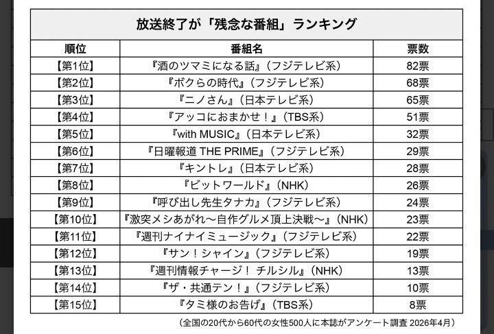 「放送終了が残念な番組はどれ?」を、全国のテレビ好きの20代から60代の女性500人にきいた。対象としたのは、2025年度で放送終了になったおもな15の番組で、そのなかから1番組を選んでもらった。