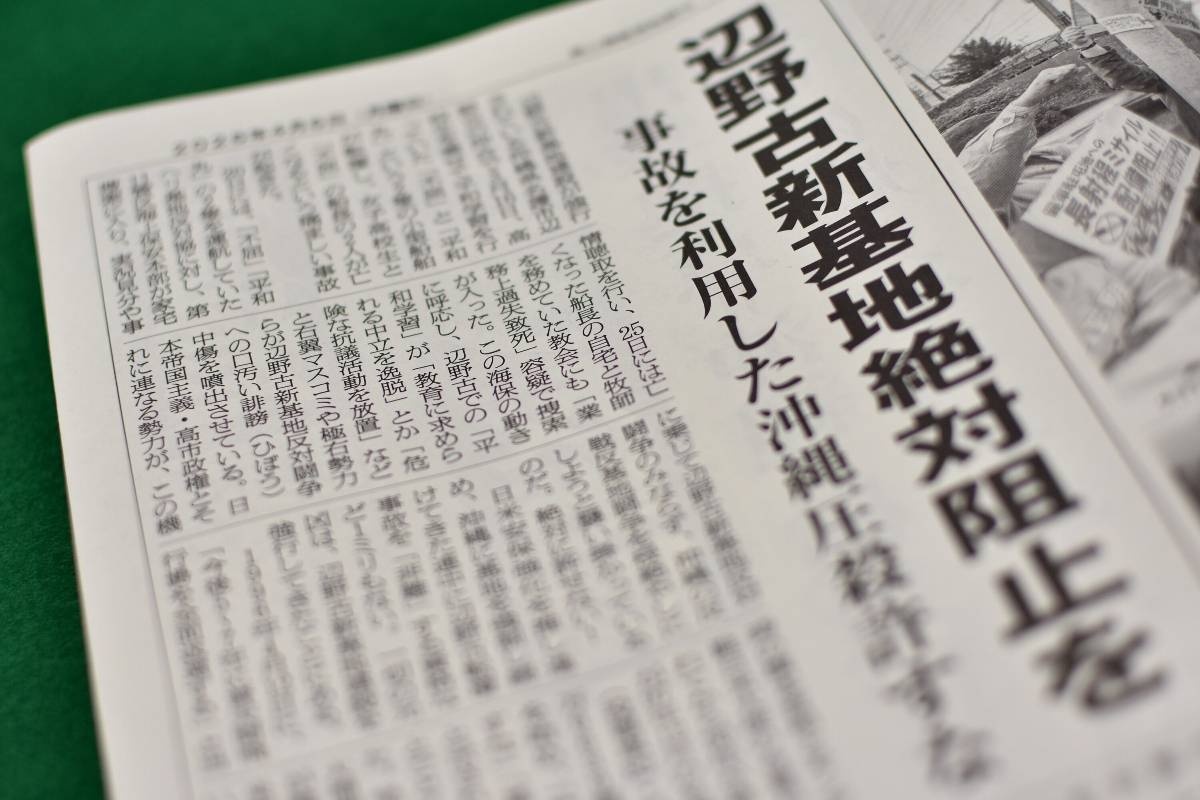 記事は「辺野古での『平和学習』が『教育に求められる中立を逸脱』とか『危険な抗議活動を放置』などと右翼マスコミや極右勢力らが辺野古新基地反対闘争への口汚い誹謗中傷を噴出させている」と指摘。