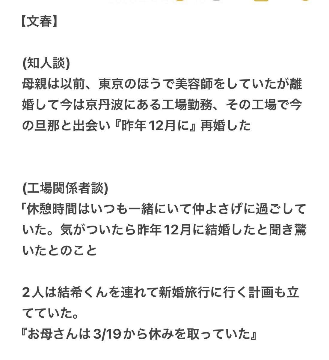 《京都・小6男児行方不明》安達結希くんの両親の言動、周辺住民の目撃談、同級生保護者の証言…名古屋主婦殺害、西東京4人母子心中“未解決事件”の裏側 | 文春オンライン3月23日、京都府南丹市立園部小学校に通う安達結希くん(11)が行方不明になった事件。 行方不明になってから6日後の29日には、小学校から西に約3キロ離れた山中で、結希くんが背負っていた黄色い通学用…bunshun.jp - 2 : 2026/04/09(木) 20:23:36.63 ID:OUyNj6mN0