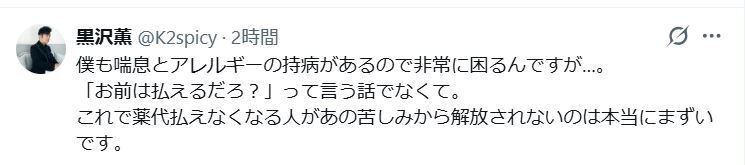 黒沢は保団連のポストを引用し、「僕も喘息とアレルギーの持病があるので非常に困るんですが…」と言及。「『お前は払えるだろ?』って言う話でなくて。これで薬代払えなくなる人があの苦しみから解放されないのは本当にまずいです」と訴えた。