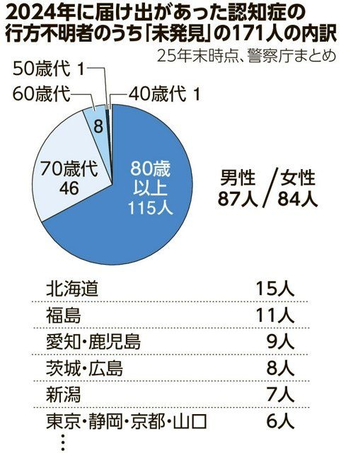 認知症の行方不明者、2年前から「未発見」171人 追跡調査で判明:朝日新聞認知症で行方不明のままになっている人はどれぐらいいるのだろうか――。警察庁によると、2024年には全国で1万8121人分の届け出があり、うち273人は同年中の発見に至らなかった。同庁が追跡調査を実施…www.asahi.com認知症で行方不明のままになっている人はどれぐらいいるのだろうか――。警察庁によると、2024年には全国で1万8121人分の届け出があり、うち273人は同年中の発見に至らなかった。同庁が追跡調査を実施したところ、翌25年末時点でも171人について届け出が解除されず「未発見」の状態になっていることがわかった。