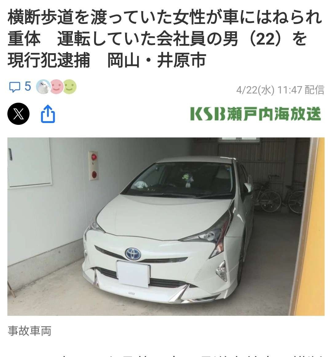 横断歩道を渡っていた女性が車にはねられ重体 運転していた会社員の男(22)を現行犯逮捕 岡山・井原市