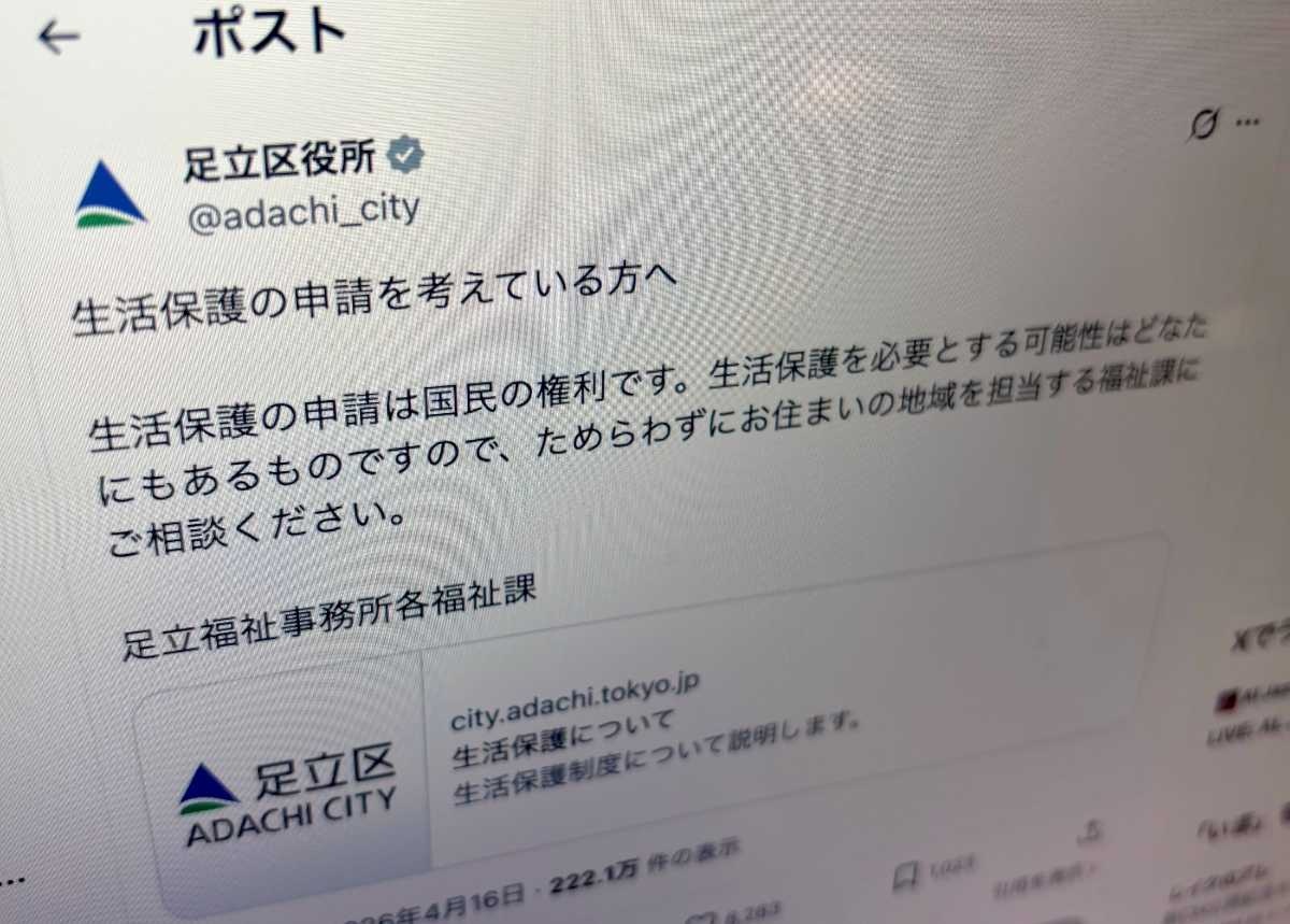 「生活保護は国民の権利」「ためらわず相談を」足立区がXで呼びかけ→「素晴らしい」と反響