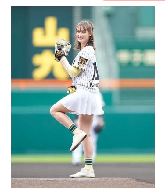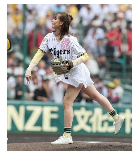 昨年7月に続き甲子園では2度目の始球式登板。その際は黒のミニスカートだったが、この日は白のミニスカートで美脚を披露し腕を振り阪神ファンを“魅了”した。