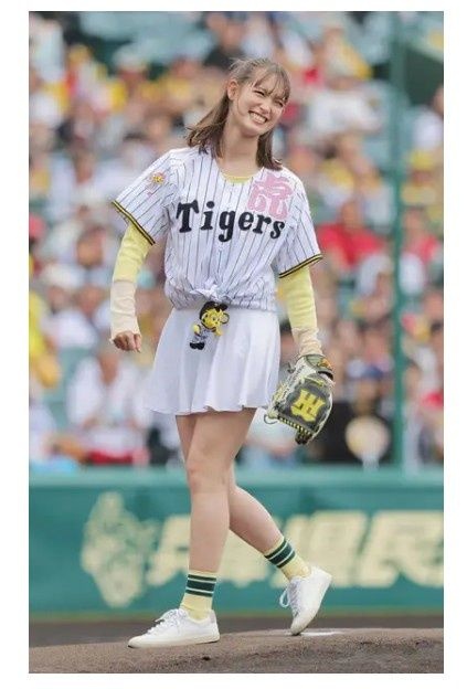 ピンク色で「虎」の文字が胸元にプリントされたユニホームの背番号は直美の「703」。歓声に包まれてマウンドに上がり、ワンバウンドの投球を披露した。