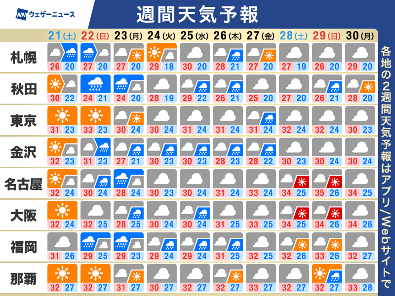 明日21日以降は最高気温が35℃を超えるような猛烈な暑さはおさまるものの、広い範囲で30℃以上の真夏日は続くでしょう。これまでより湿度がアップし、ムシムシと不快な暑さが続きそうです。