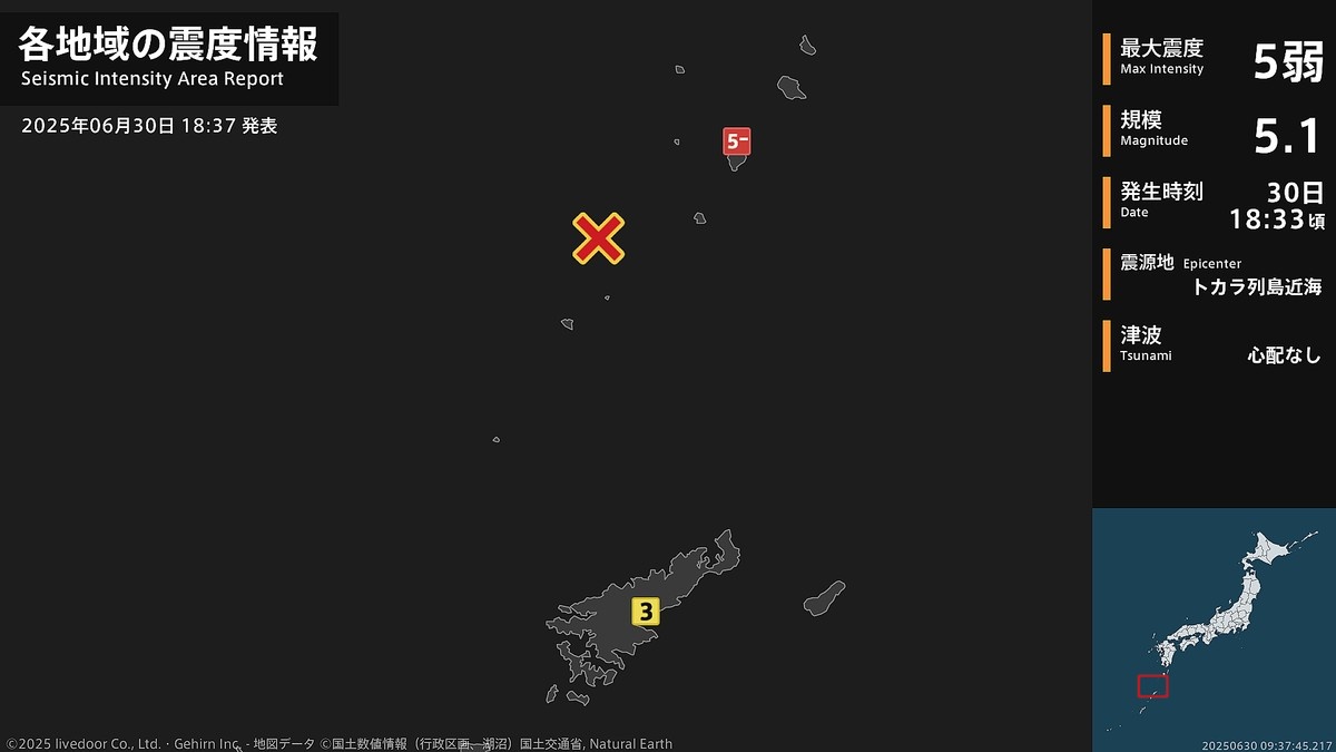 【地震情報 2025年6月30日】18時33分頃、トカラ列島近海を震源とする地震がありました。震源の深さは約30km、地震の規模はM5.1、最大震度5弱を鹿児島県で観測しています。この地震による津波の心配はありません。◆