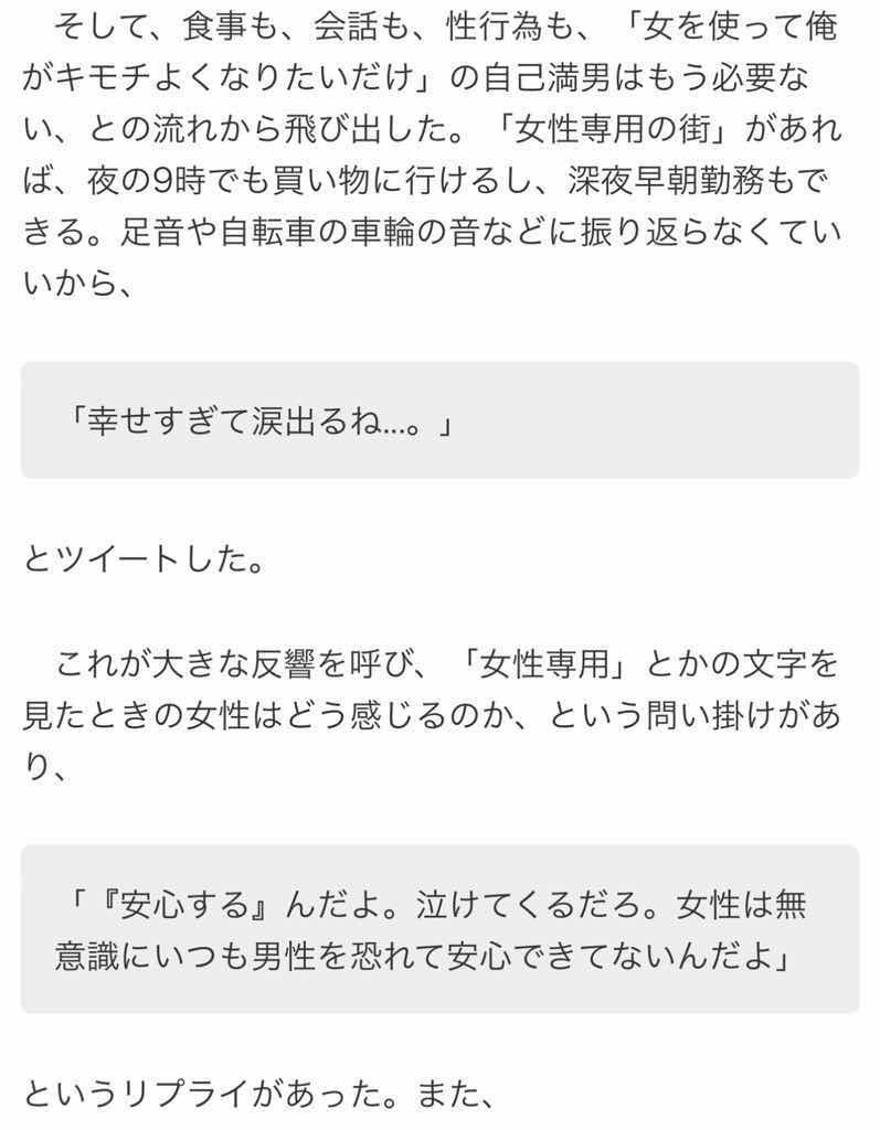 「女性専用の街があったら夜の9時でも買い物に行ける。