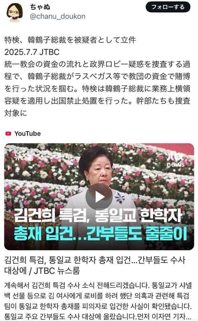 Vtuberデビル🦇壺被害1億円☠️統一教会元2世🇯🇵国対ヒアリング参加 (@9999DEVIL6666) on X㊗️速報㊗️ 韓国、#統一教会 総裁 韓鶴子を立件‼️ 幹部らも捜査対象‼️ 明日はちょうど安倍元首相襲撃事件からピッタリ3年目‼️ 見てるか山上 統一教会に神はいないぞ‼️x.com - 2 : 2025/07/08(火) 11:31:00.84 ID:BMMoV8Ix0